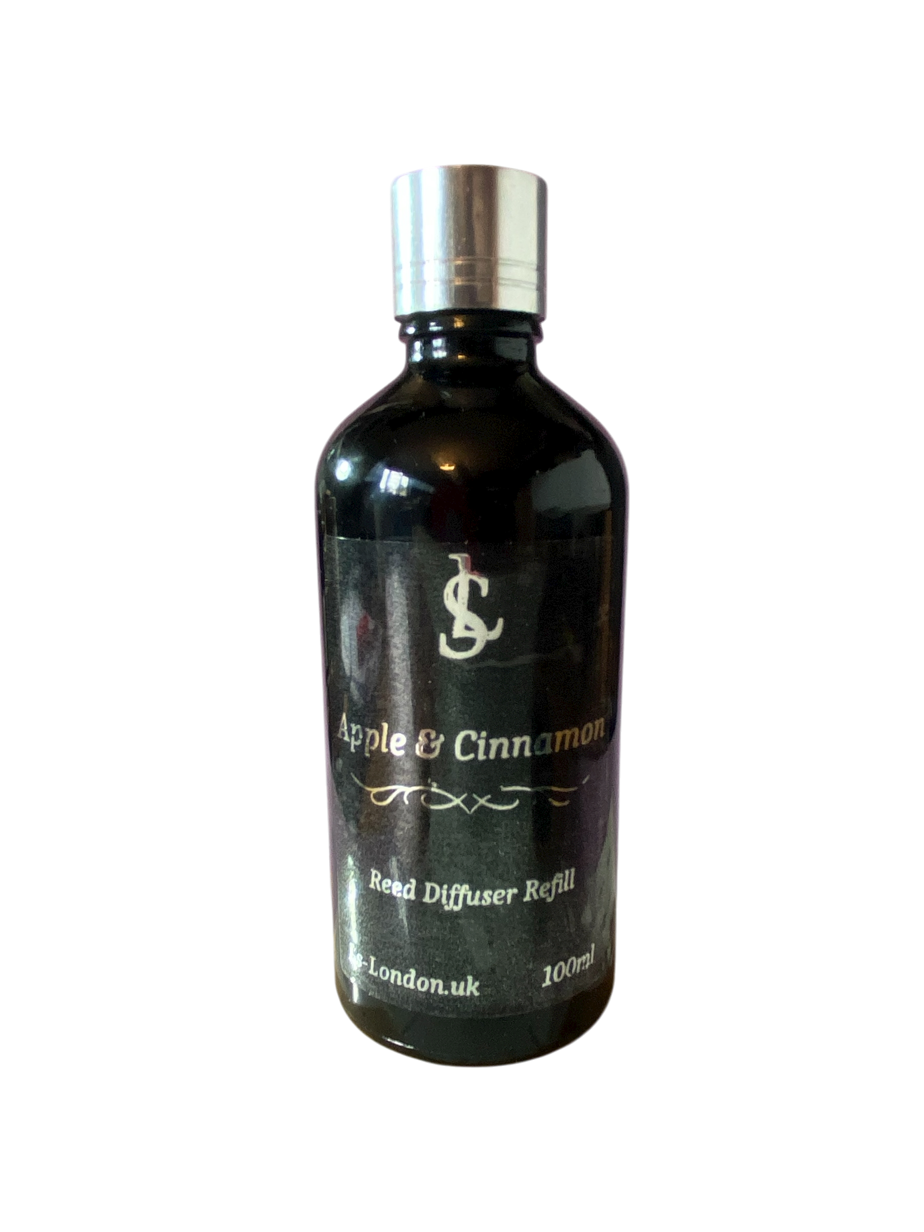 Apple & Cinnamon reed diffuser refills are available in 100ml black glass and 30ml squeezable plastic refills.