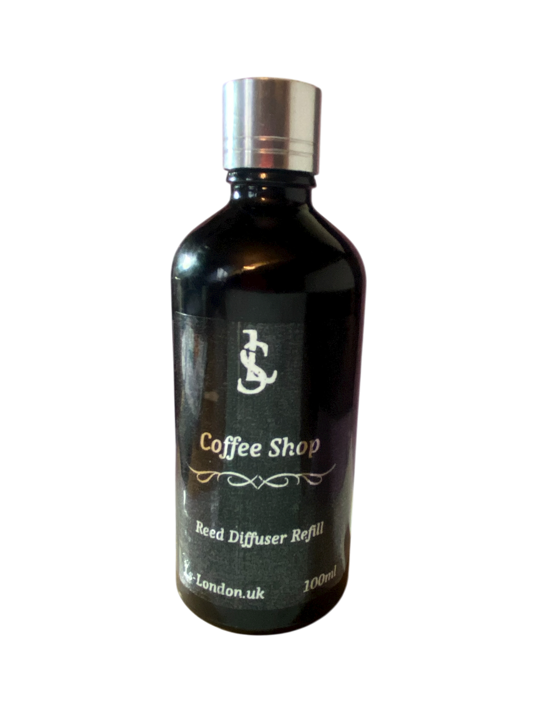 Coffee Shop reed diffuser refills are available in 100ml black glass and 30ml squeezable plastic refills.
