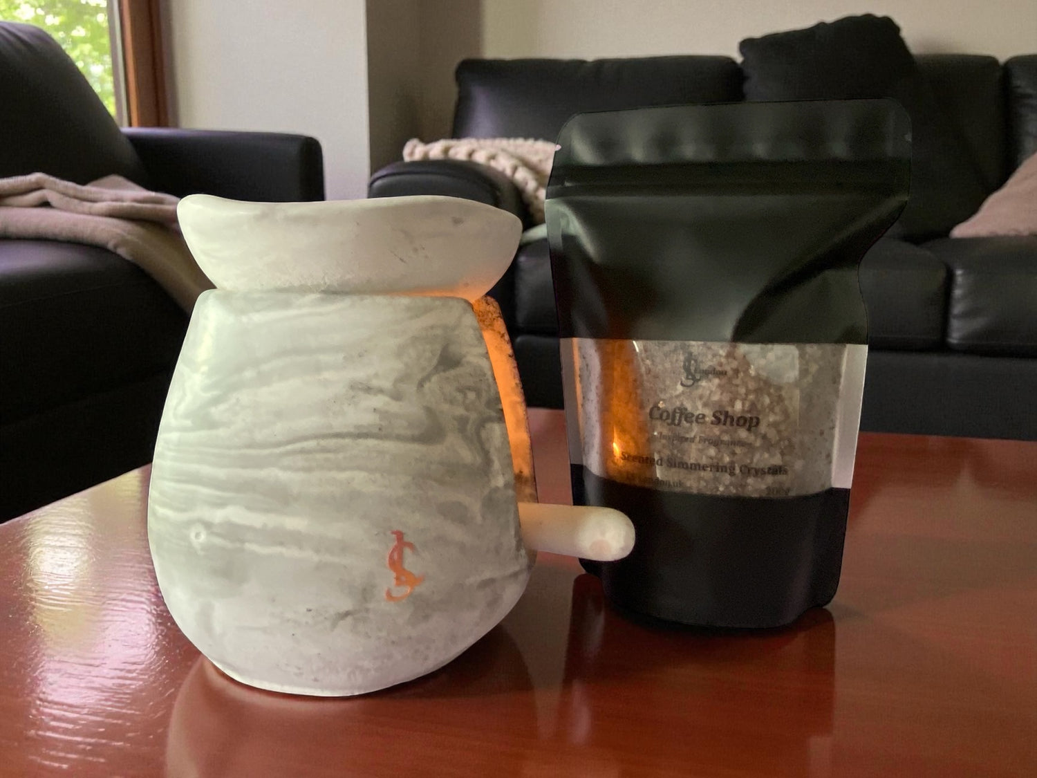 This is where you will find Coffee Shop scented simmering crystals (Sizzlers).